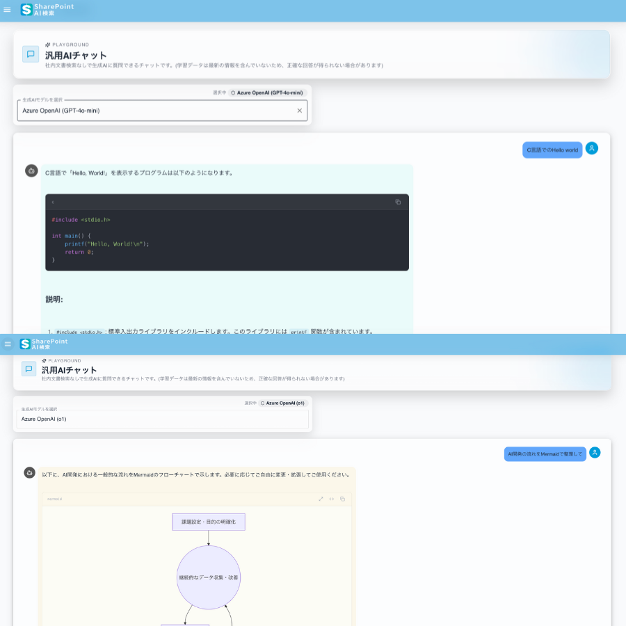 SharePointのドキュメント検索なしで汎用的な内容のチャット利用が可能。
